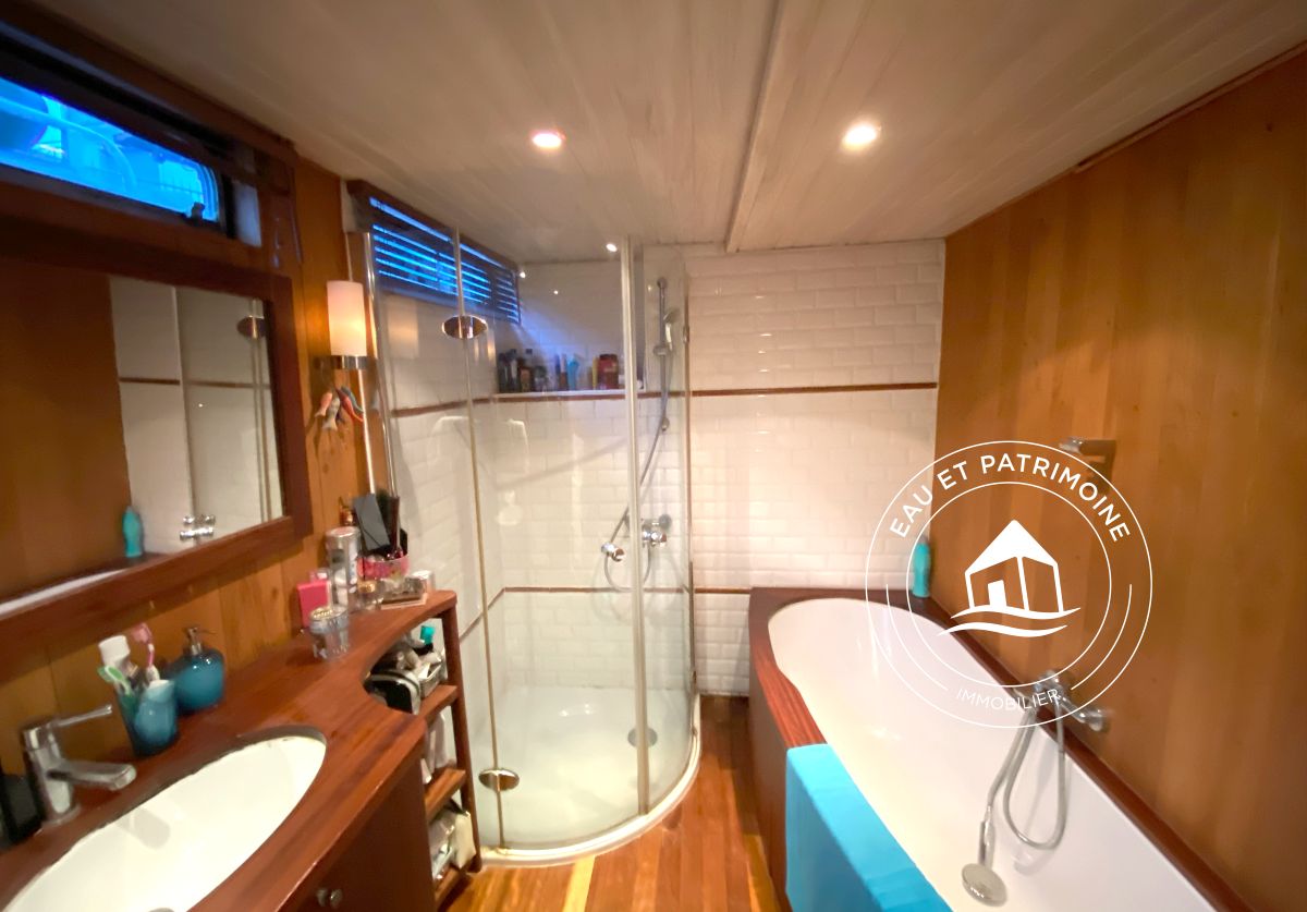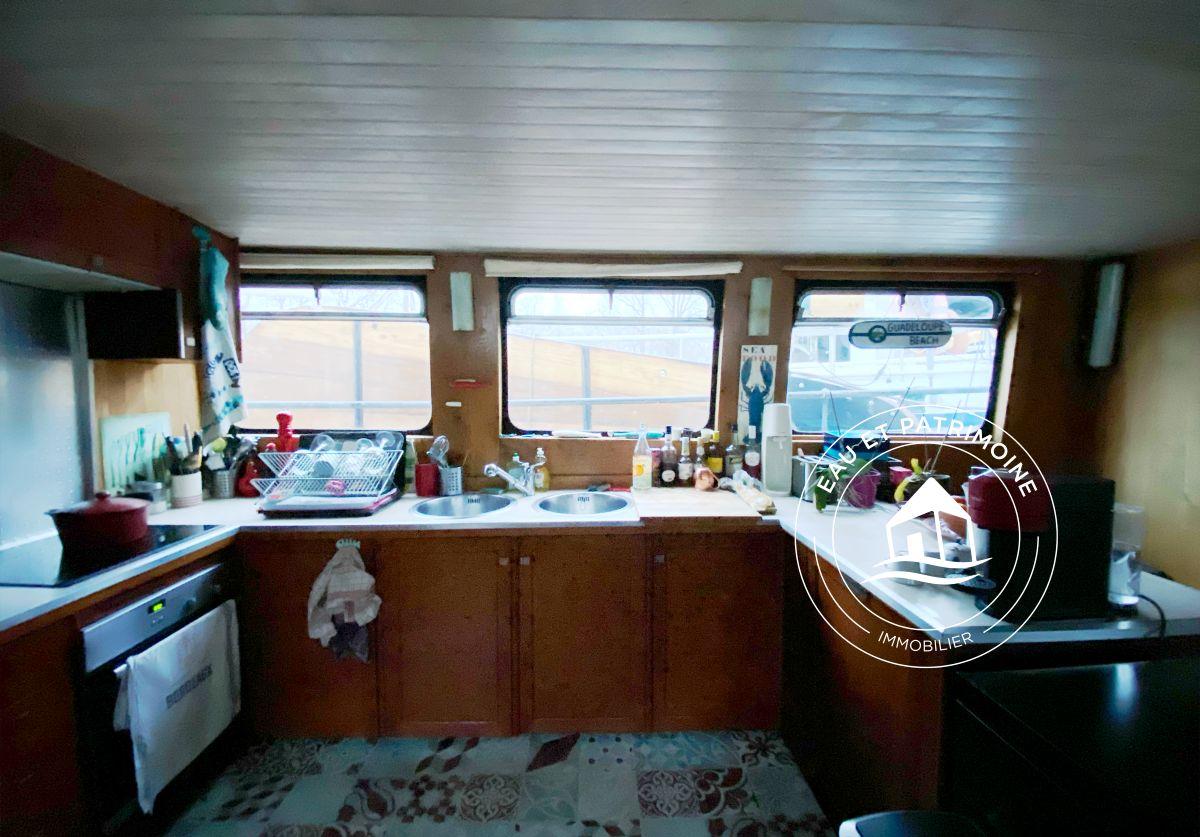 Péniche d’habitation en très bon état, située à Paris, XVème arrondissement, comprenant une grande timonerie, pièce de vie, en surplomb ; en bas : salon avec cuisine ouverte, 2 cabines dont 1 vaste avec dressing, salle de bains avec douche et baignoire.