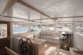 – Entrée par la timonerie (poste de pilotage) aménagée en espace de détente